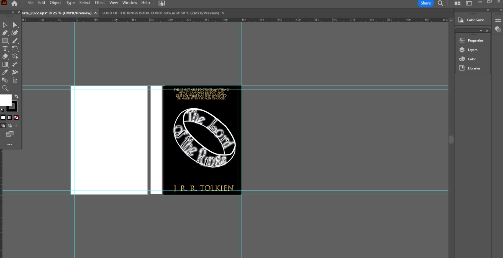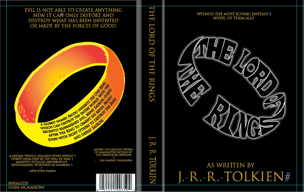 This was an assignment where we had to create a new cover for a classic novel, incorporating shape into the title. I choose Lord of the Rings, creating a ring shape from the title, as well as adding light to symbolize the power of the ring as well as the themes of darkness vs light. Various trials and errors on designing the cover.