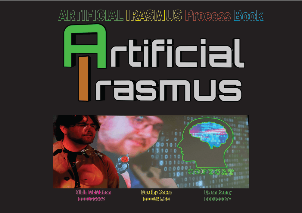 Process book for Artificial Irasmus, a short film about a dead actor being brought back from the dead with AI. I worked on this project with Destiny Coker and Dylan Kenny. There were some productions issues as some people had to be kicked out due to laziness and disturbing behaviour, so I had to take over this and redesign it all from scratch, however I ended up with sextuple the work done within a far shorter timeline with over 60 pages of content breaking down the story, costume design and character profiles.