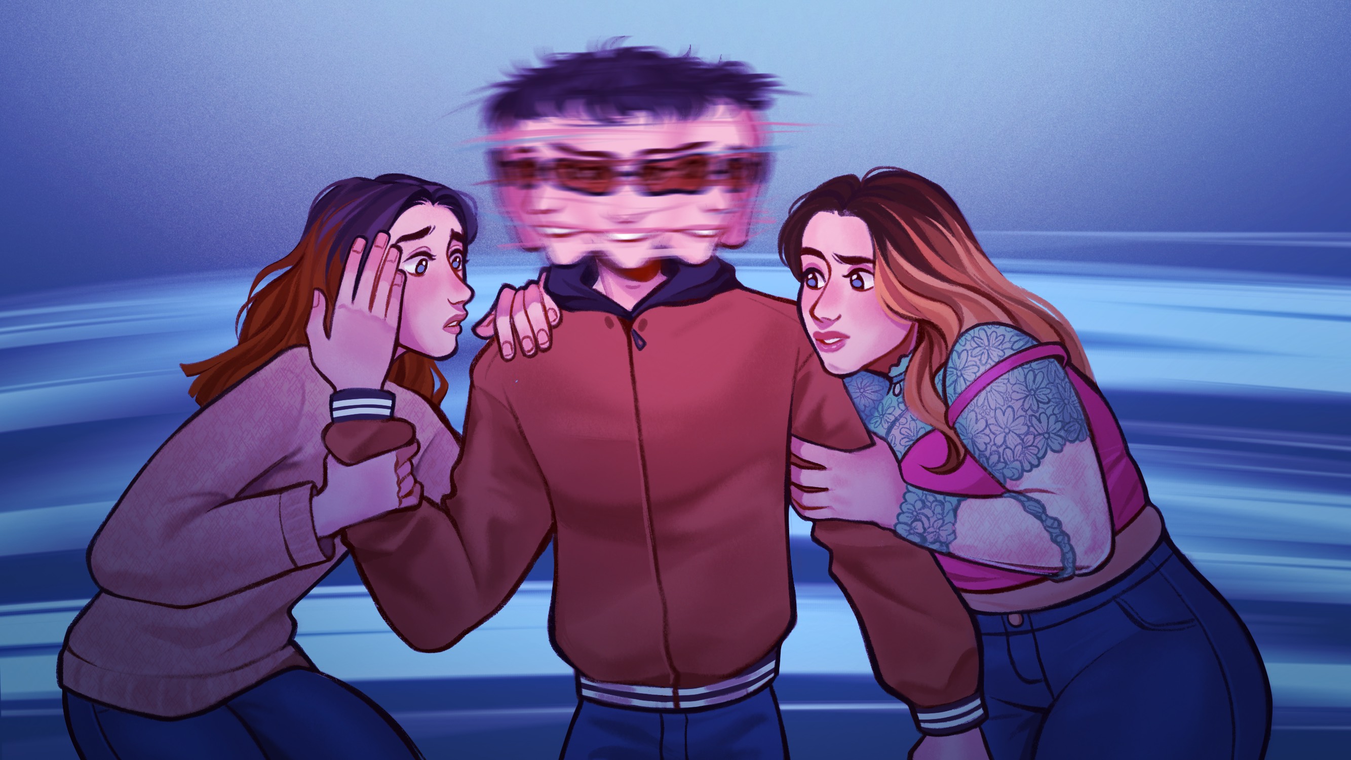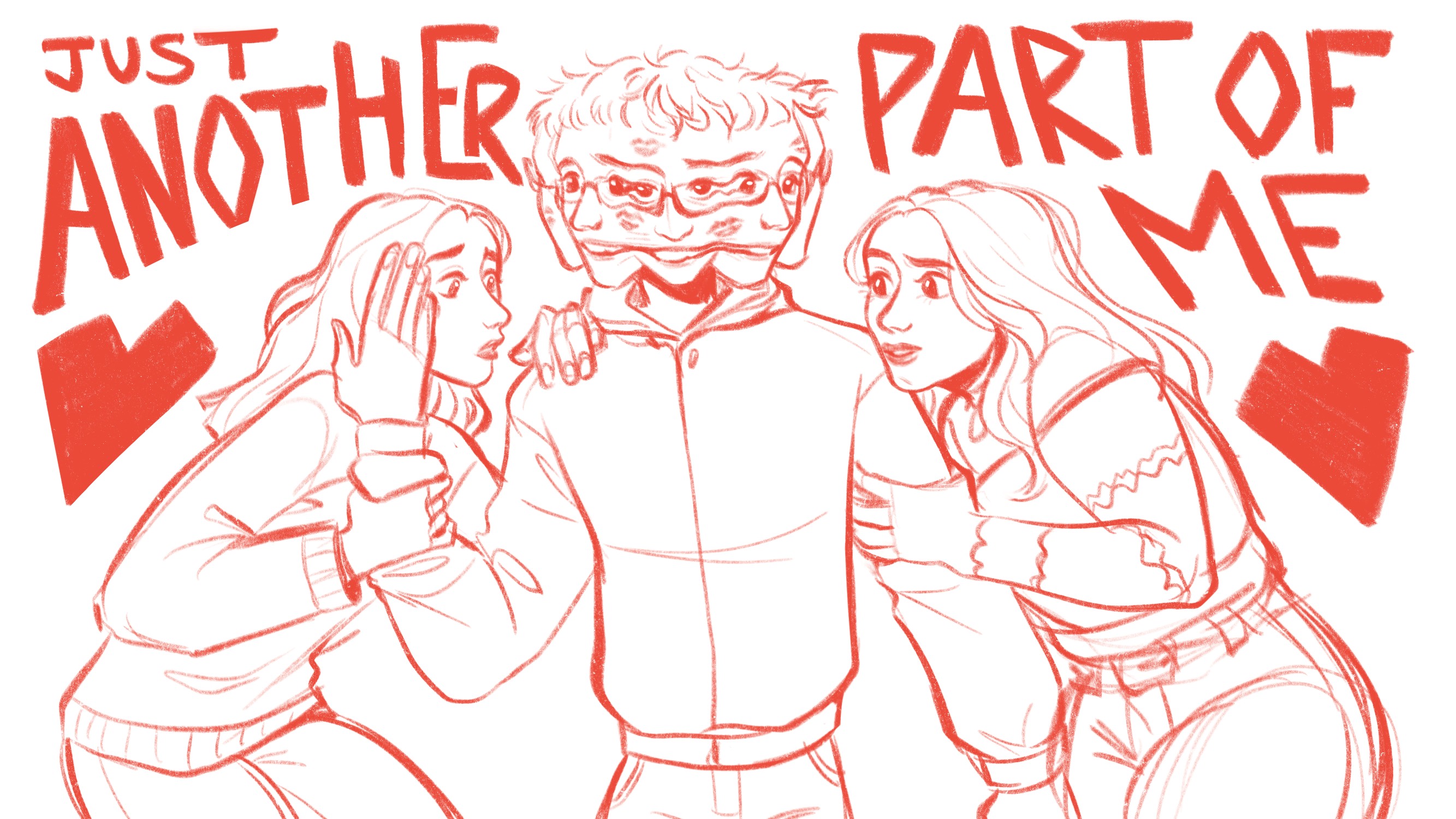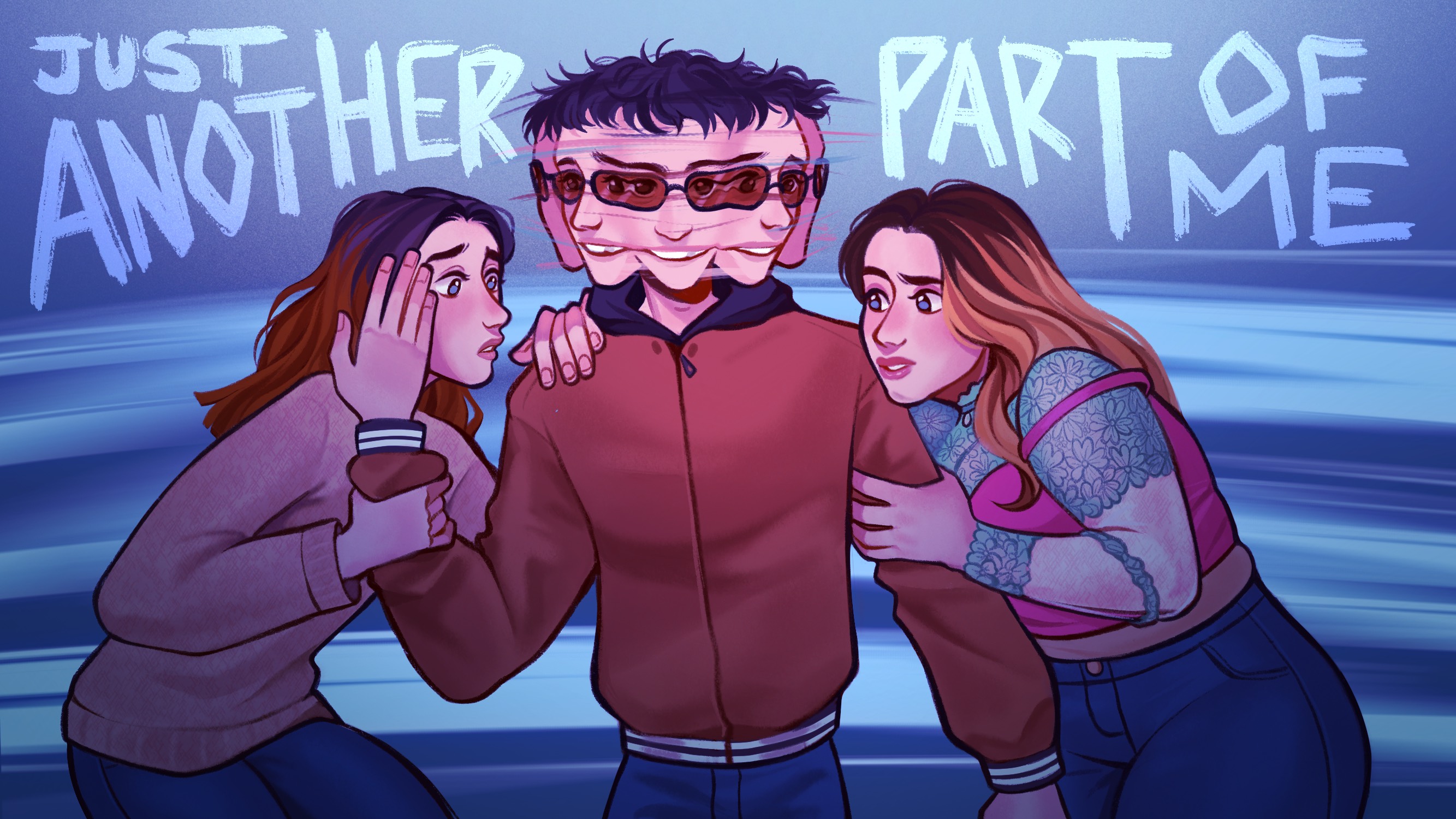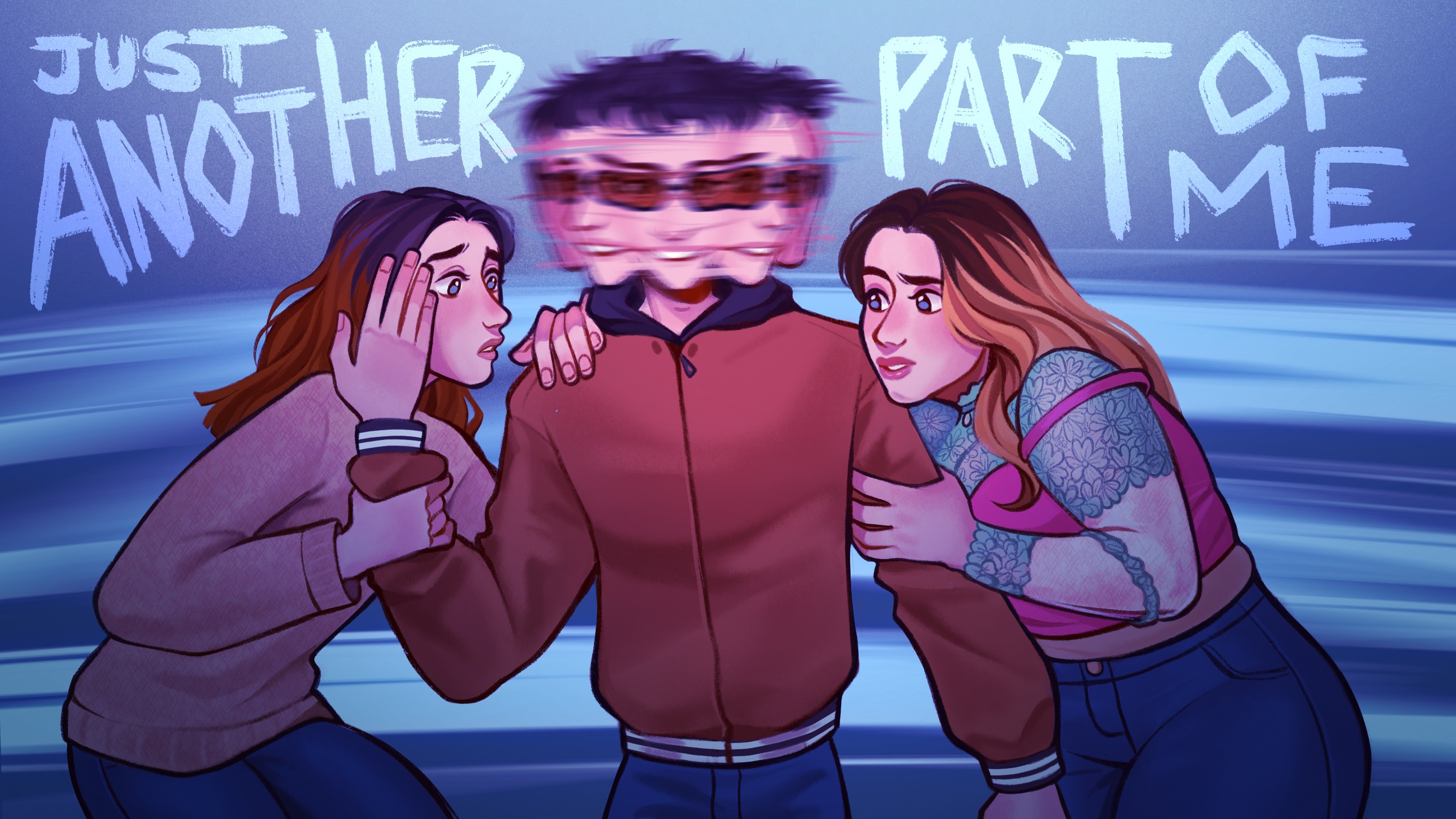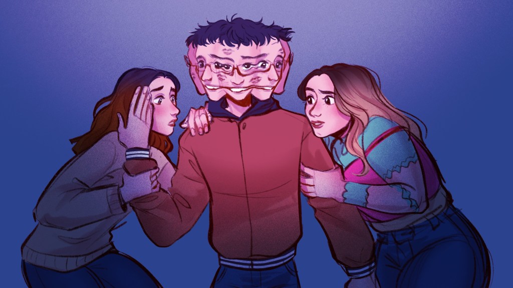 “For the illustration I was inspired by the references [Oisín] sent me, with one woman on each side of the main character, holding on to him. Their facial expressions are meant to showcase their personalities: one is more anxious and the other one rather confused. As for the main character, I wanted to give him multiple heads/faces melting into each other to represent his DID diagnosis. The faces that are looking at the girls have sweeter looks in their eyes, showing the love he does have for them”.