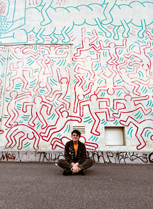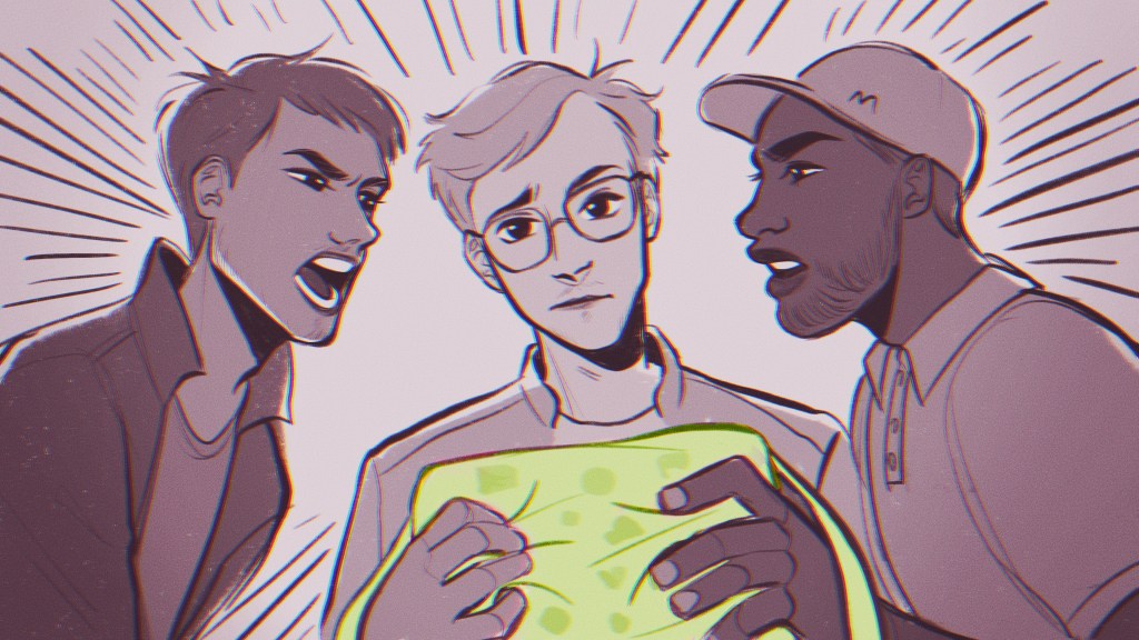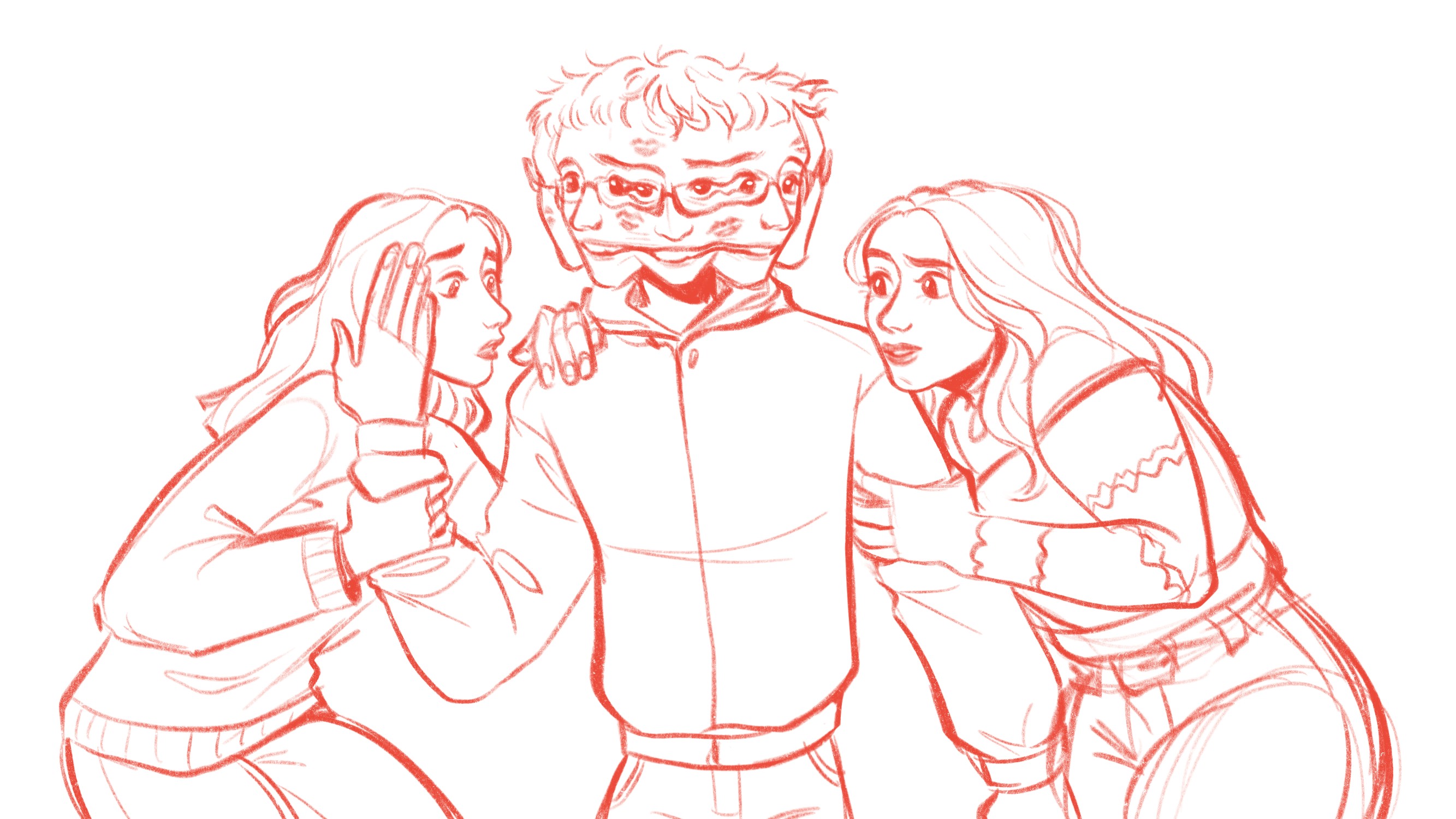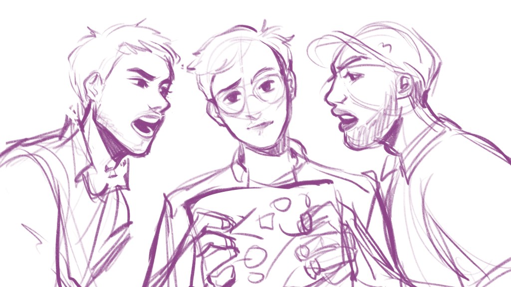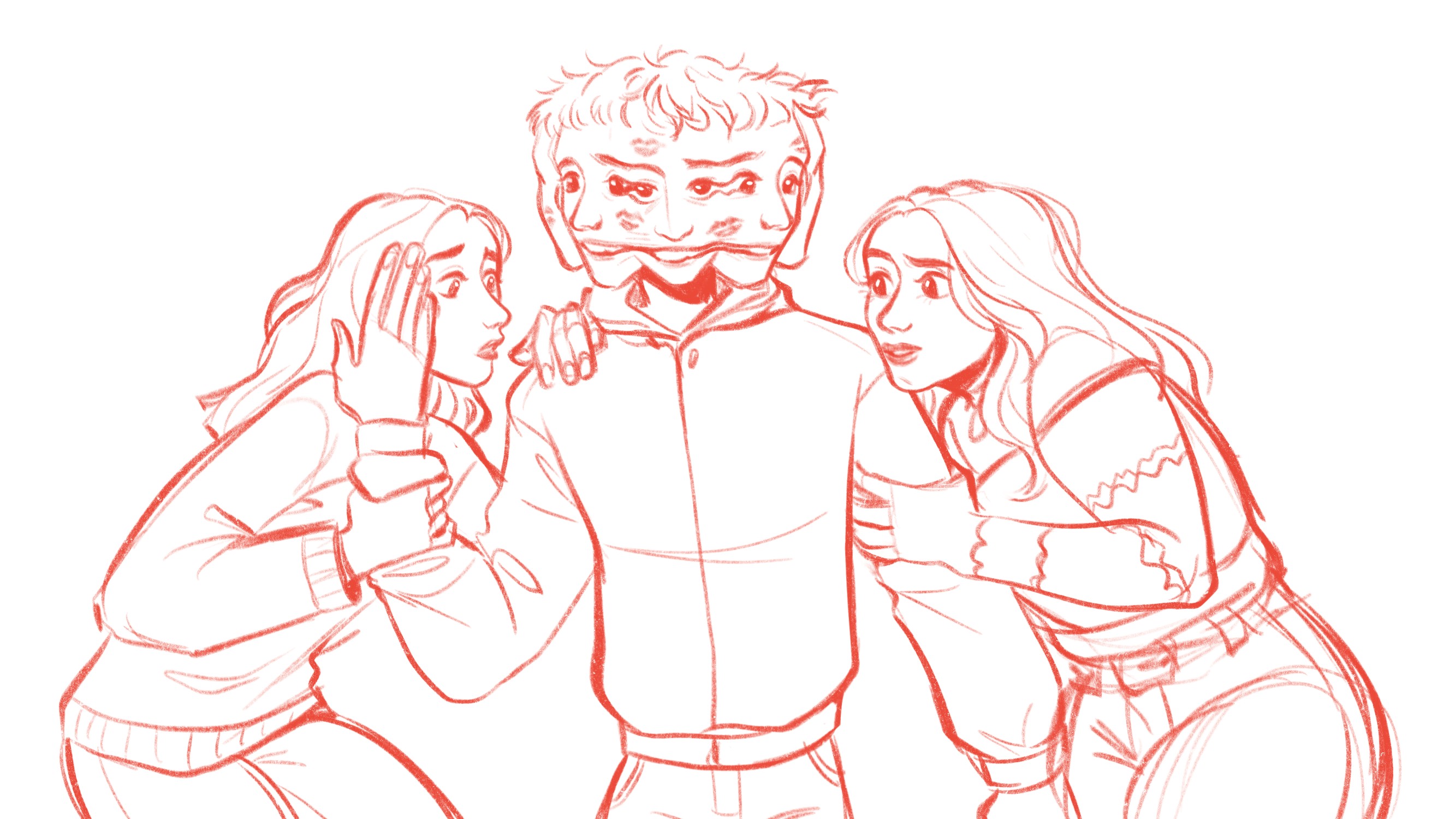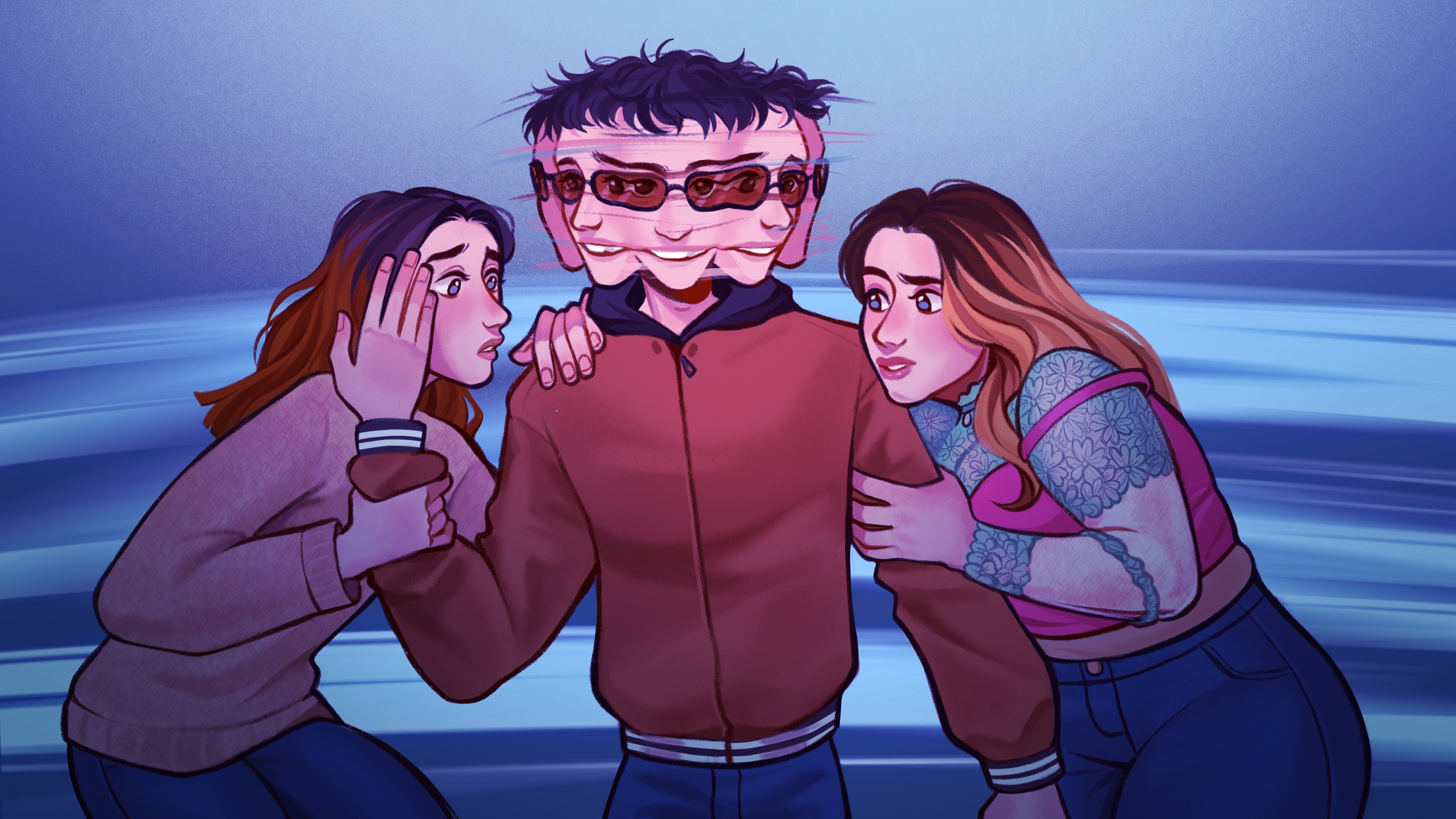 “For the illustration I was inspired by the references [Oisín] sent me, with one woman on each side of the main character, holding on to him. Their facial expressions are meant to showcase their personalities: one is more anxious and the other one rather confused. As for the main character, I wanted to give him multiple heads/faces melting into each other to represent his DID diagnosis. The faces that are looking at the girls have sweeter looks in their eyes, showing the love he does have for them”.